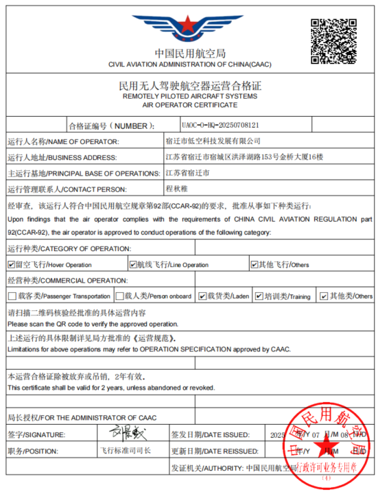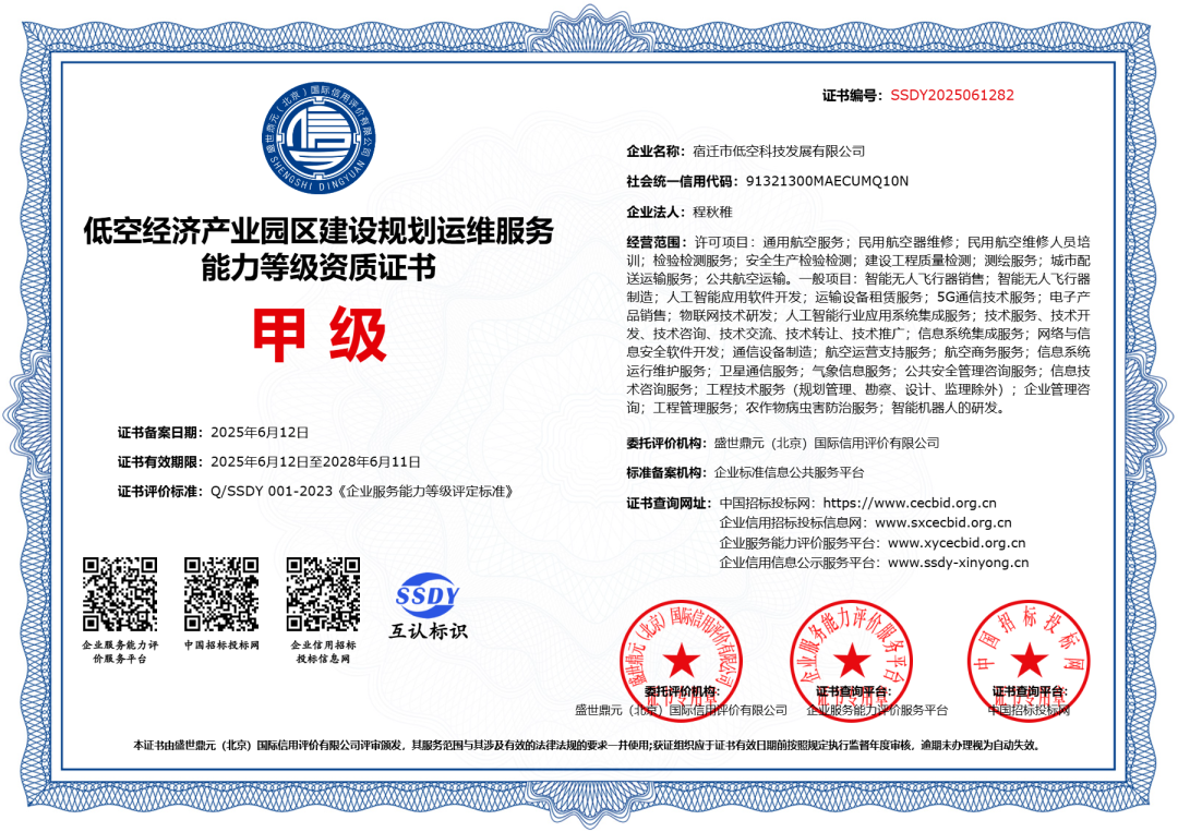 這些資質及合格證的取得,不僅是國家相關主管部門對低空科技公司綜合實力、技術能力和安全管理體系的高度認可,也為其在低空經濟領域開展更多場景應用和產業合作奠定了堅實的基礎。標志著低空科技公司已具備在低空經濟核心業務領域提供全方位、專業化服務的能力,能夠合規、高效地開展各類低空飛行及相關配套業務。
