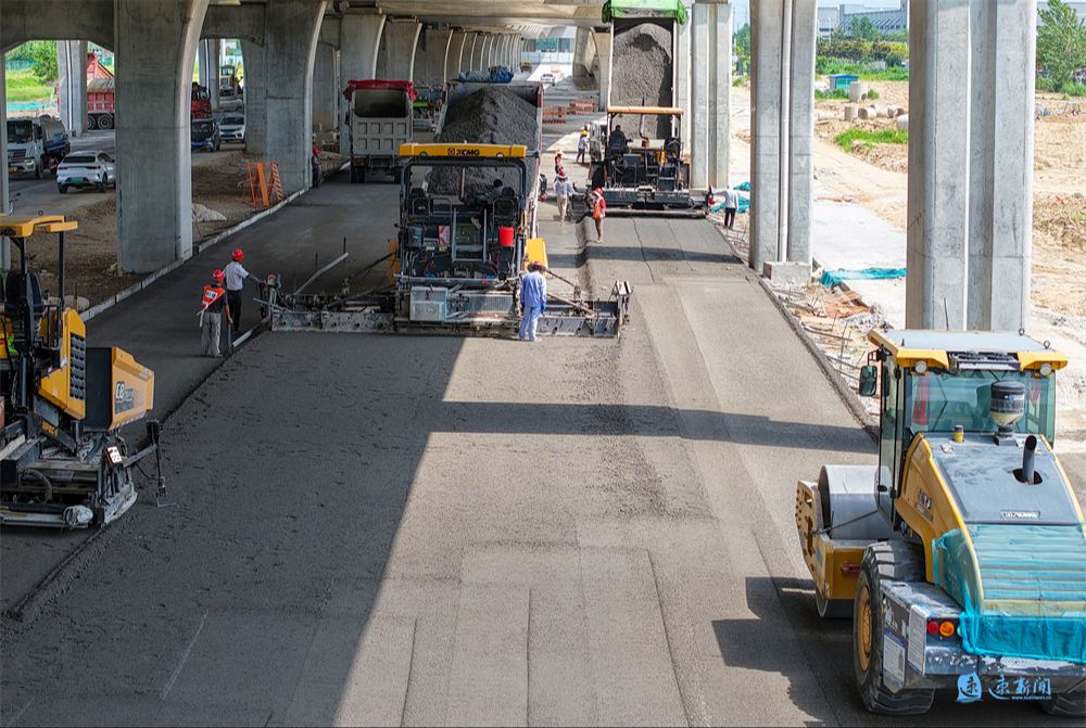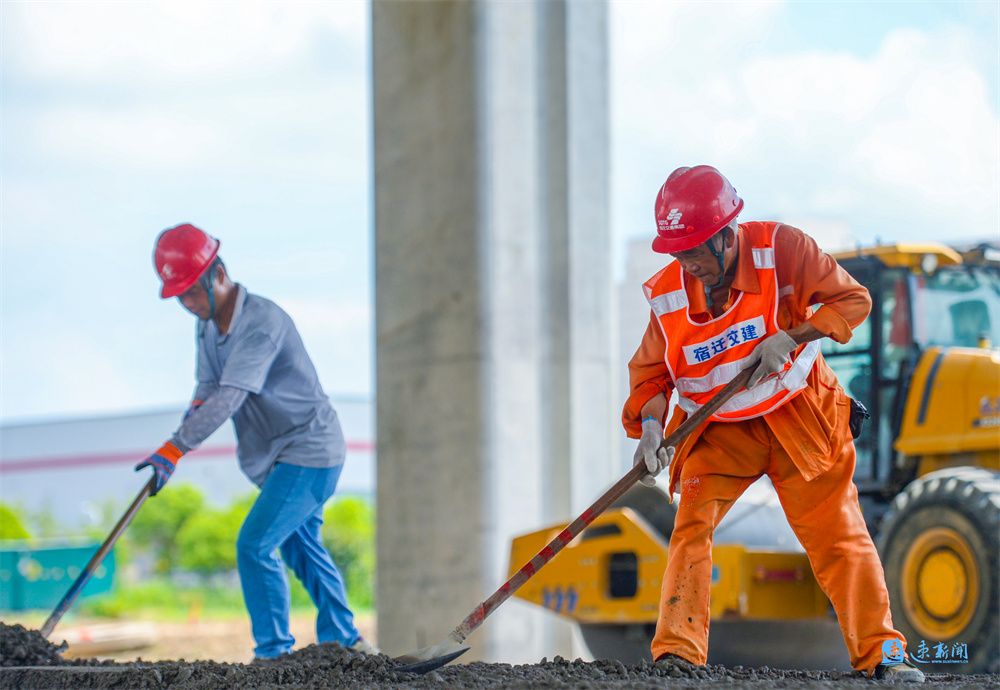 7月22日,在宿遷市宿豫區酒都路快速化改造工程現場,建設者們在高溫下加緊施工,全力推進項目建設。