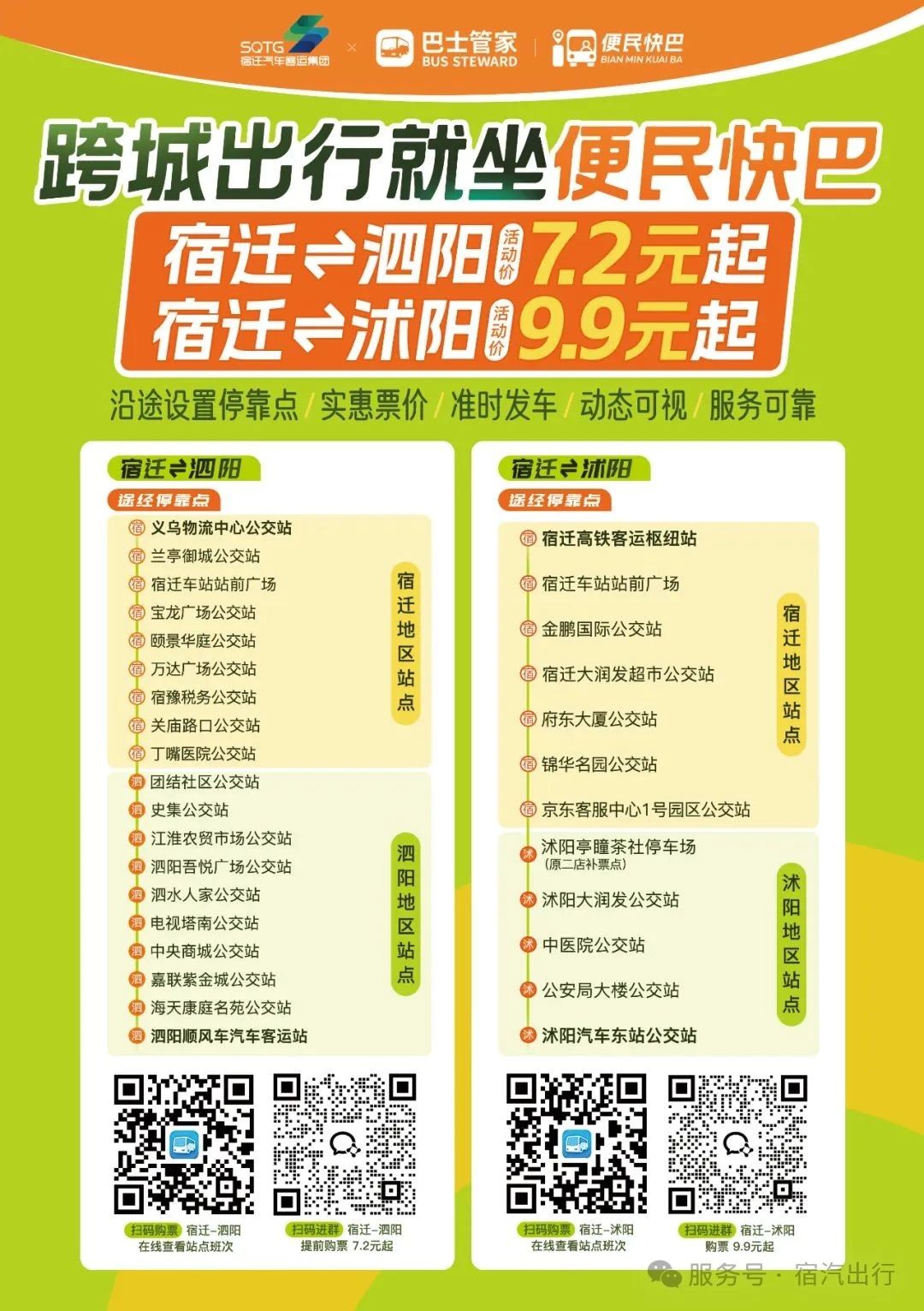 【宿汽集團】宿遷往返沭陽低至9.9元!便民快巴新線+1