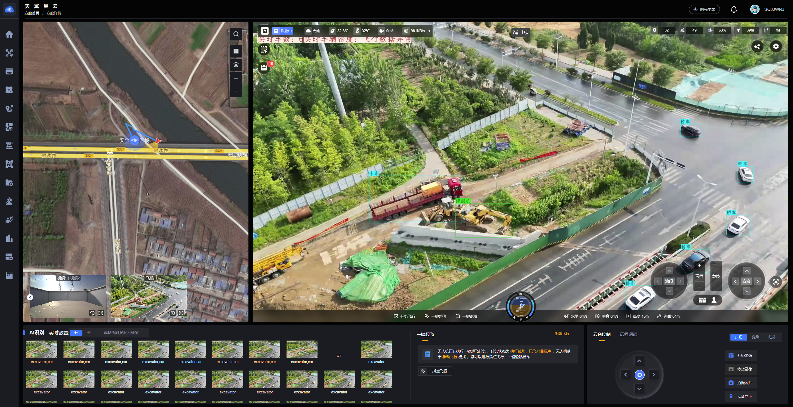 此外,在宿遷大道快速化改造工程3標,無人機正在代替安全員進行巡檢,越是在施工忙碌的時候,無人機飛得更勤。它一路攀升到60米高空,項目施工進度、安全生產等情況全都被高清鏡頭“收入囊中”,化作實時數據流,飛速傳輸到市級飛控平臺里,利用內置AI算法自動識別隱患行為,并自動標記位置、推送預警、督促整改,形成全鏈條管理閉環。
