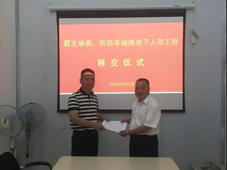 9月2日下午,市住建局、市交通集團在霸王舉鼎地下人防工程會議室舉行了霸王舉鼎和幸福路地下人防工程移交儀式。