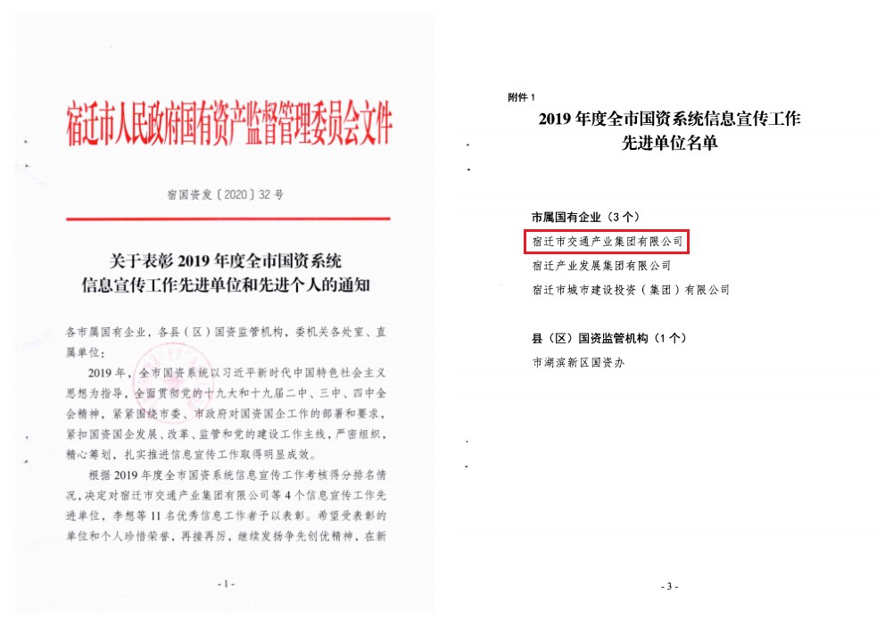 近日,宿遷市國資委發(fā)布《關于表彰2019年度全市國資系統(tǒng)信息宣傳工作先進單位和先進個人的通知》,市交通集團以考核得分排名第一的好成績,榮獲2019年度信息宣傳工作先進單位。