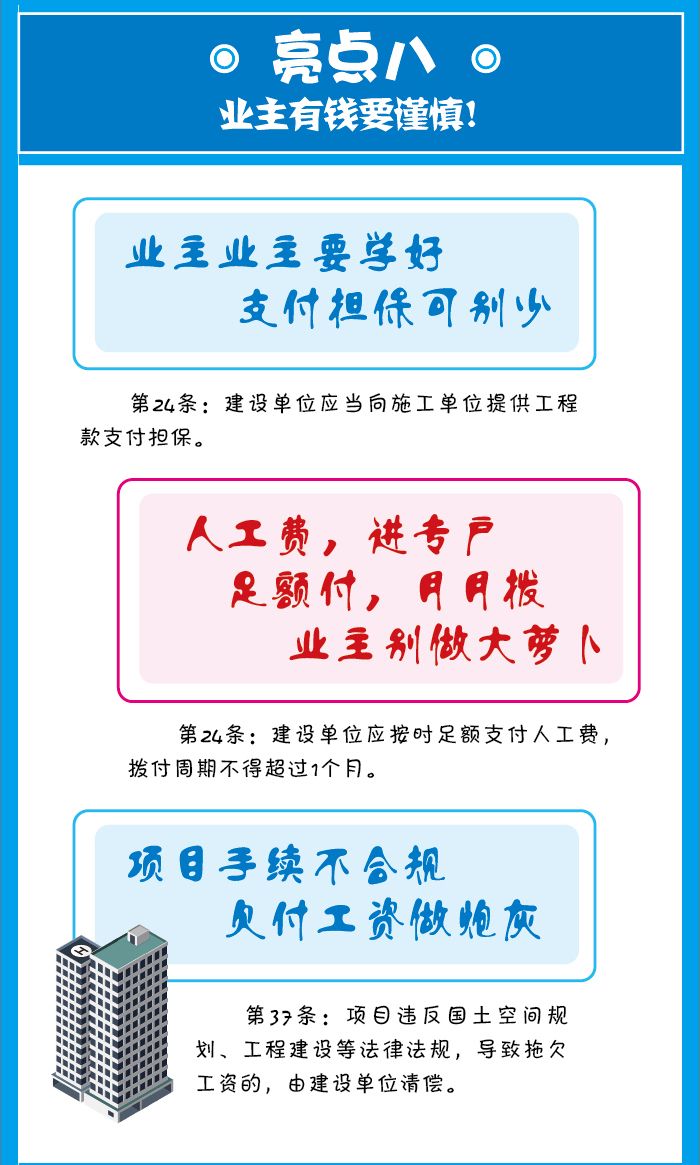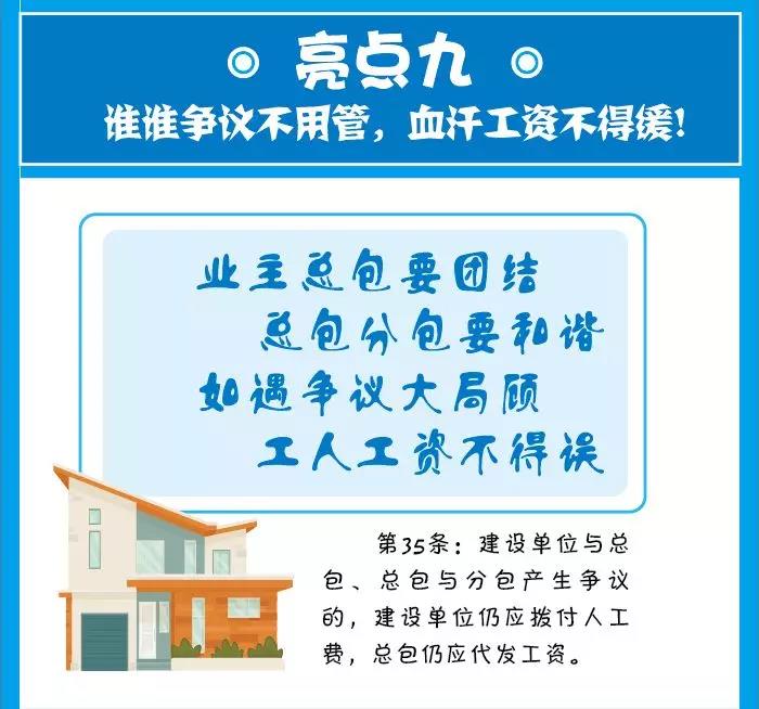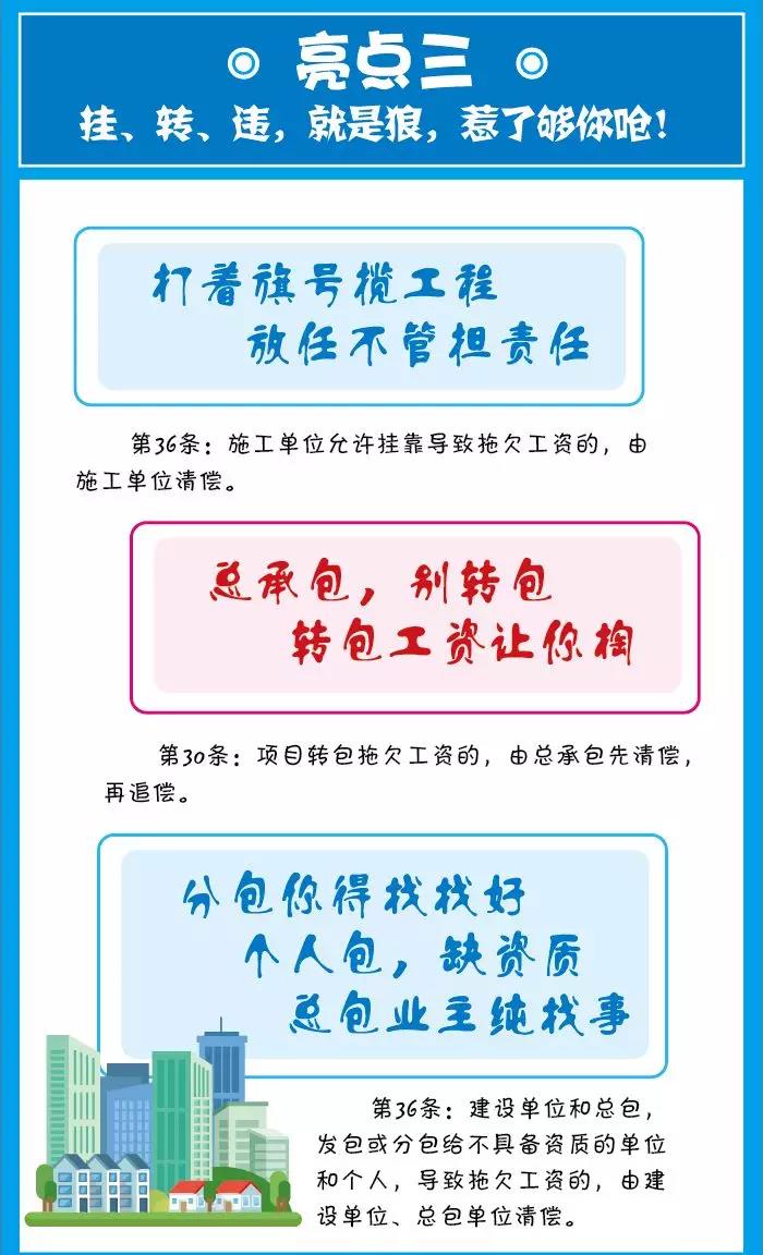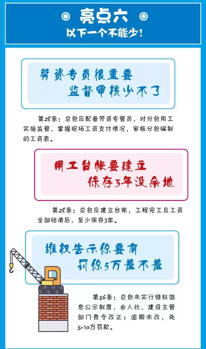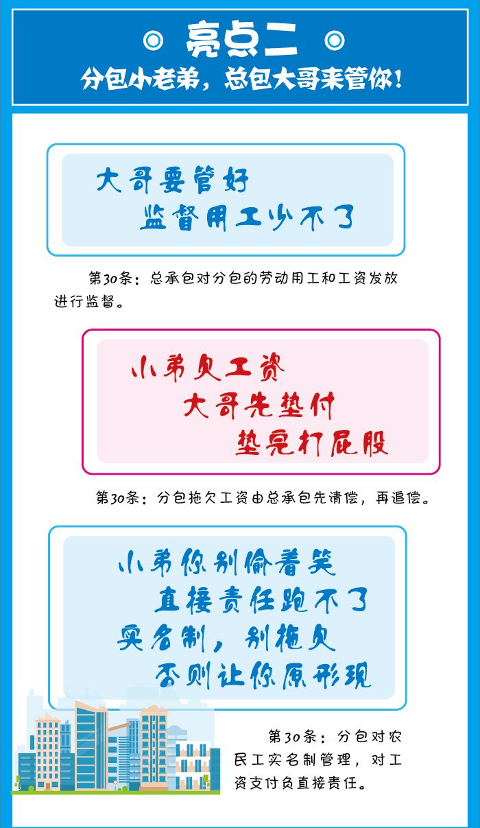 該條還規定了總包單位對分包單位的用工和工資發放進行監督的責任,這跟之前的總包單位單純的收取配合費而對放任分包單位的用工及工資發放。這也為保障農民工能切實拿到工資提供了法律依據。