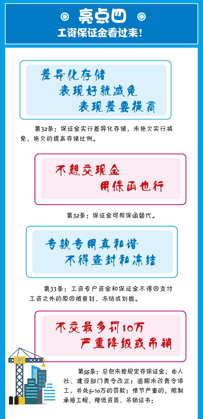 為切實保障總包能代發工資,《條例》規定其要存儲一定的工資保證金,工資保證金的數額施行差異化存儲,未拖欠單位的比例降低,拖欠的提高比例。該工資保證金也可用金融機構的保函代替,要注意此處是金融機構的保函,不是普通的擔保公司的保函。