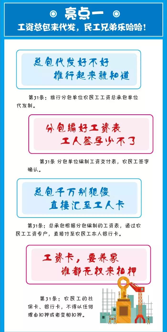 該條規定了總承包單位代分包單位發放分包單位所招用的農民工的工資,分包單位每月要將農民工簽字確認的工資表交給總包,總包直接將工資發放到農民工的工資卡里面,也就是說總包要將工資單獨拎出來由其對外直接予以發放,不再由分包單位發放,這樣可以確保農民工能實實在在的拿到工資,而且任何單位和個人均不得扣押農民工的工資卡,條例也規定了對扣押工資卡的處罰措施。