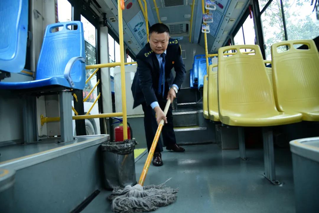 公交駕駛員利用發班間隙的休息時間打掃車輛