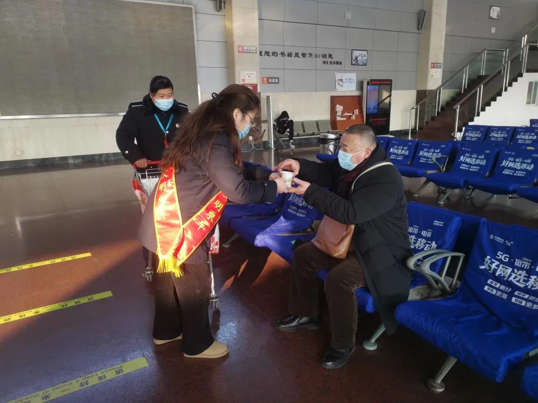 活動中,全體黨員到宿遷汽車客運站開展疫情防控、志愿服務等工作,筑牢疫情防控平安線,溫暖旅客幸福回家路;引導旅客依次排隊有序進站,幫助老年旅客出示“蘇康碼”“行程碼”,持續落實真情服務理念,方便旅客出行;組織專人到候車大廳為候車旅客送熱水,讓旅客們感受到旅途溫暖。