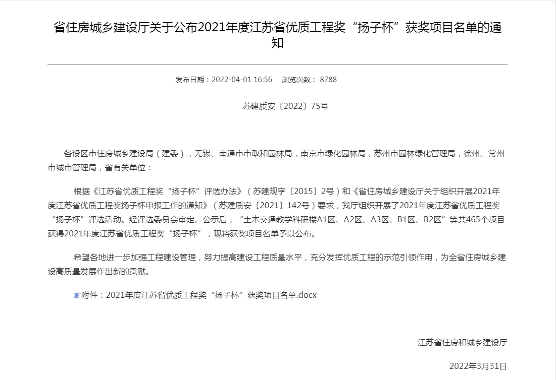 近日,省住房和城鄉建設廳公布了2021年度江蘇省優質工程獎“揚子杯”獲獎項目名單,其中,宿遷交通集團代建的江蘇通湖物流園一期配載中心工程、宿遷市綜合客運樞紐建設工程景觀綠化施工項目名列其中,江蘇通湖物流園一期智能配載中心工程項目更是以宿遷市房建工程項目綜合評分第一名的好成績榮登榜首。