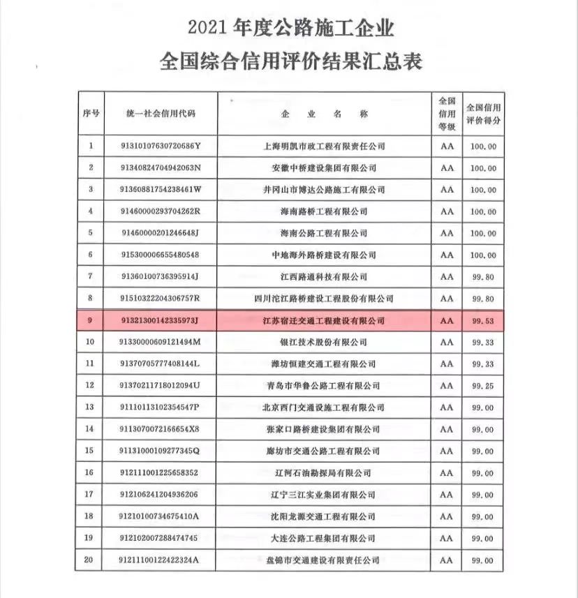 近日,中國交通運輸部公布了2021年度公路建設市場全國綜合信用評價企業名單。宿遷交建以99.53的高分再次獲評“2021年度公路施工企業全國綜合信用評價AA級”。
