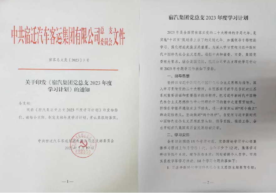 始終堅(jiān)持把學(xué)習(xí)貫徹黨的二十大精神作為首要政治任務(wù),印發(fā)《宿汽集團(tuán)黨總支2023年度學(xué)習(xí)計(jì)劃》,明確黨建學(xué)習(xí)基礎(chǔ)架構(gòu)。