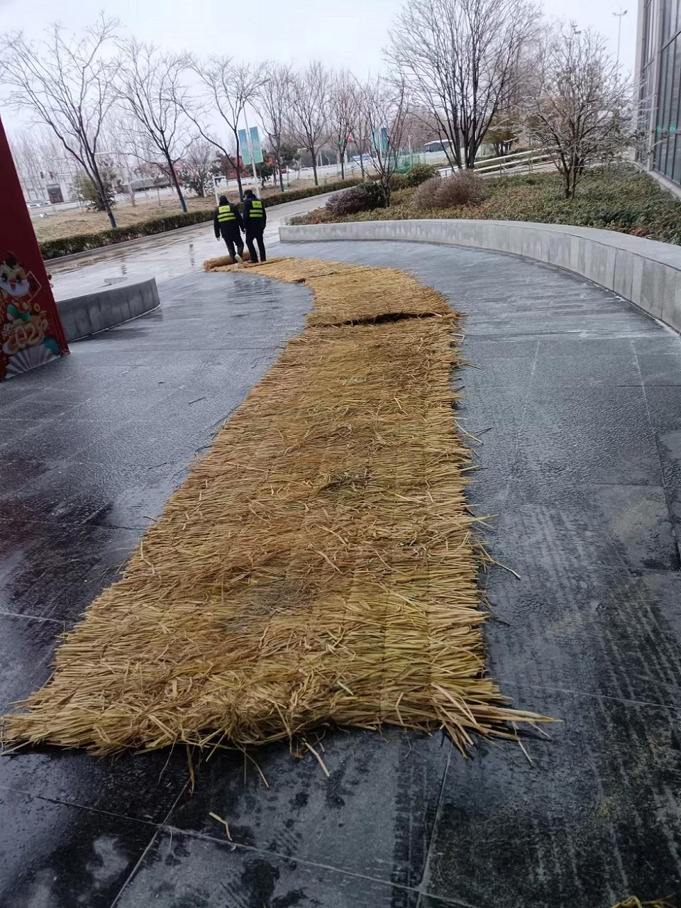 通湖物流園提前儲備防滑材料、融雪劑等應急物資,在園區入口、坡道等重點路段鋪設防滑草墊,防止出現事故;做好園區內物流企業安全宣教工作,督促企業提醒貨運司機注意應對嚴寒冰凍天氣,確保行車安全。